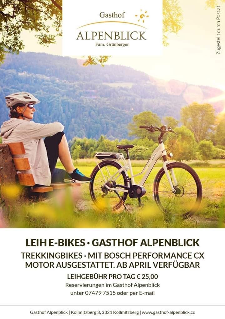 Leih-E-Bikes: E-Bikes können Sie gegen eine Tagesleihgebühr von € 25,-- im Gasthof Alpenblick in Kollmitzberg ausleihen. Akkuleistung ca. 60 bis 80 km. Bitte um Vorreservierung unter T: 07479/75 15.