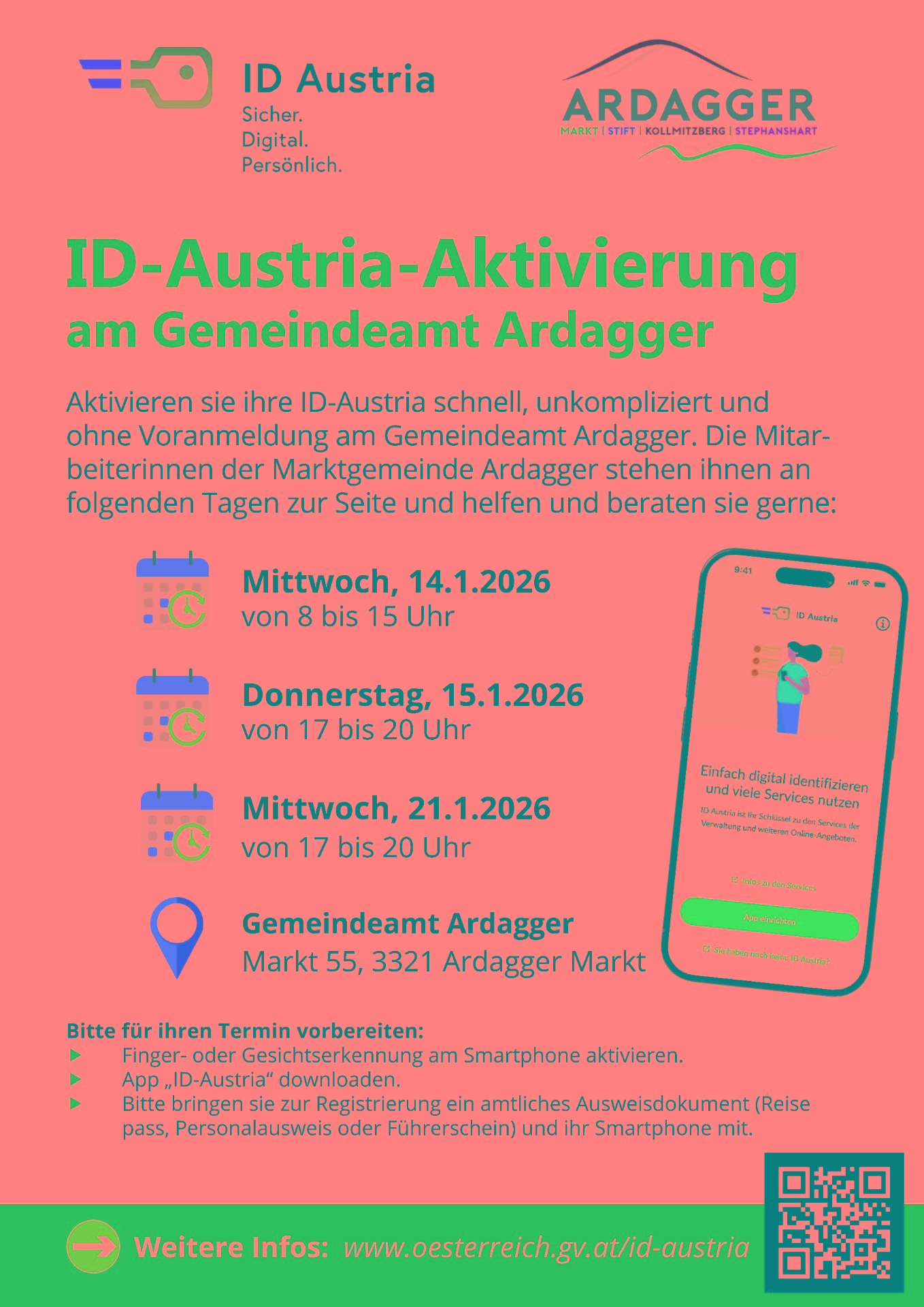 - Registrierung am Gemeindeamt laufend mit Terminvereinbarung am Gemeindeamt Ardagger bei Sonja Amon T: 07479/7312-13