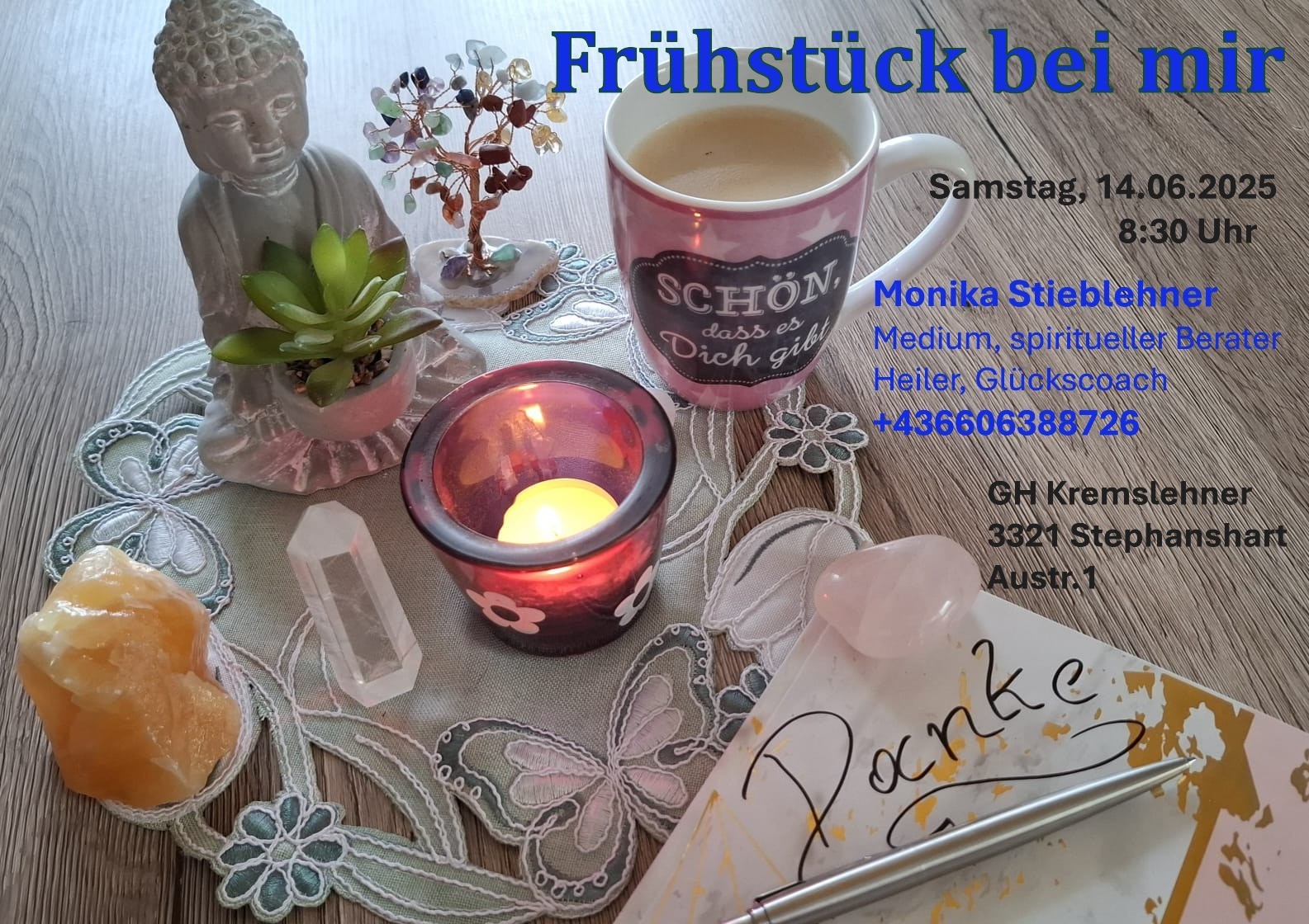 "Frühstück bei mir" – Ein guter Tag beginnt im Herzen So startest du in einen perfekten Tag! Stell dir vor, du beginnst deinen Tag ganz bewusst – mit einer sanften Atemübung, einer geführten Meditation und einem Moment der Dankbarkeit. Genau das erwartet dich bei meinem neuen Herzensformat: "Frühstück bei mir". Jeder Morgen ist ein Neubeginn – und gemeinsam machen wir ihn zu etwas Besonderem. Wir treffen uns am Samstag, 14. Juni 2025 um 8:30 Uhr im Gasthaus Kremslehner, 3321 Stephanshart, Austr. 1 um in liebevoller Runde zur Ruhe zu kommen und unsere Energie auszurichten für einen kraftvollen und positiven Tagesbeginn. (Dauer ca. 1 ½ Std. = 25,-) Anschließend lassen wir – wer mag – den Morgen bei einem kleinen Frühstück (= 13,-) in gemütlicher Runde ausklingen. Ein Angebot für alle, die mit Leichtigkeit, Freude und innerer Klarheit in den Tag starten möchten. Lass uns den Tag gemeinsam mit Licht, Liebe und Leichtigkeit begrüßen. Ich freue mich auf dich. Herzensgrüße Monika Stieblehner = Deine Lichtbrücke Kosten: € 25,- Morgenroutine € 13,- Frühstück GH. KremslehnerSo startest du in einen perfekten Tag! Ein Angebot für alle, die mit Leichtigkeit, Freude und innerer Klarheit in den Tag starten möchten.