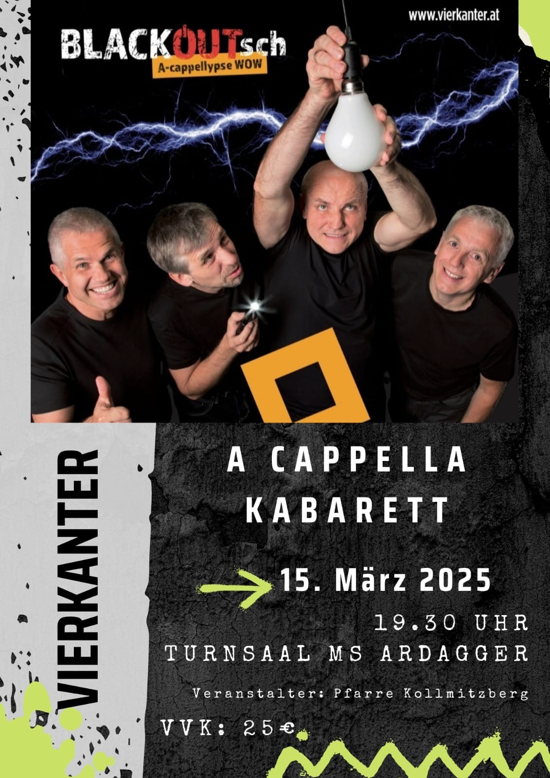 Die Vierkanter singen a capella und überzeugen mit pointenreichen Einlagen. Die Lachmuskeln kommen garantiert nicht zu kurz. Wir freuen uns sehr über Ihren geschätzten Besuch.A capella Lieder und Kabarett