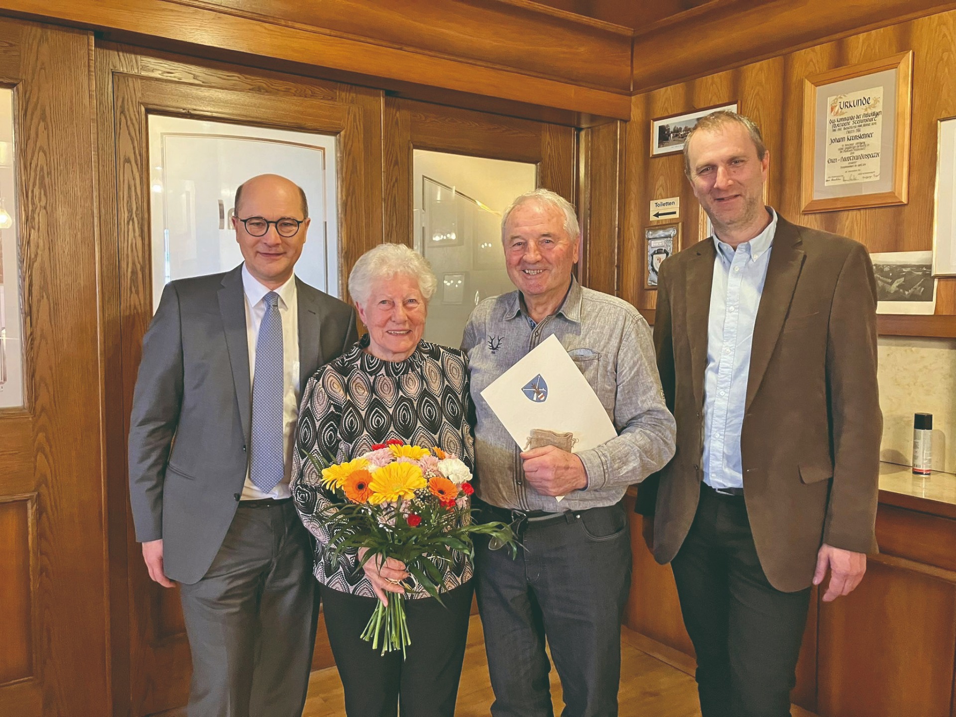 Foto v.l.n.r.: Bgm. DI Johannes Pressl, Maria und Karl Schmidthaler und OV Christian Zehethofer. © zVg