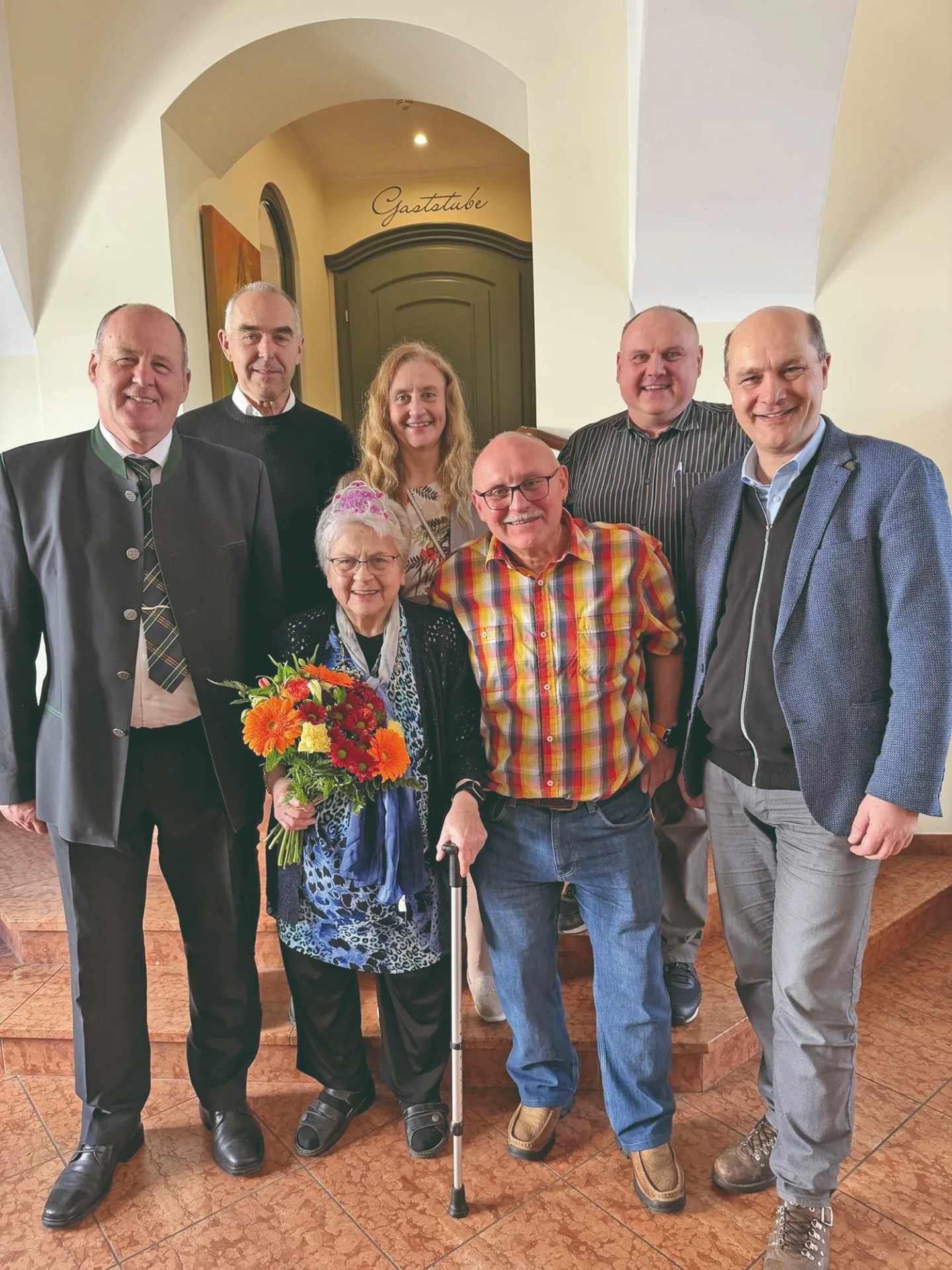 Foto v.l.n.r.: Vbgm. Josef Frühwirth, Seniorenobm. Josef Deutenhauser, Jubilarin Ludmilla Weber, Sabine Steinkellner, Karl Weber, Bruno Weber und Bgm. DI Johannes Pressl.