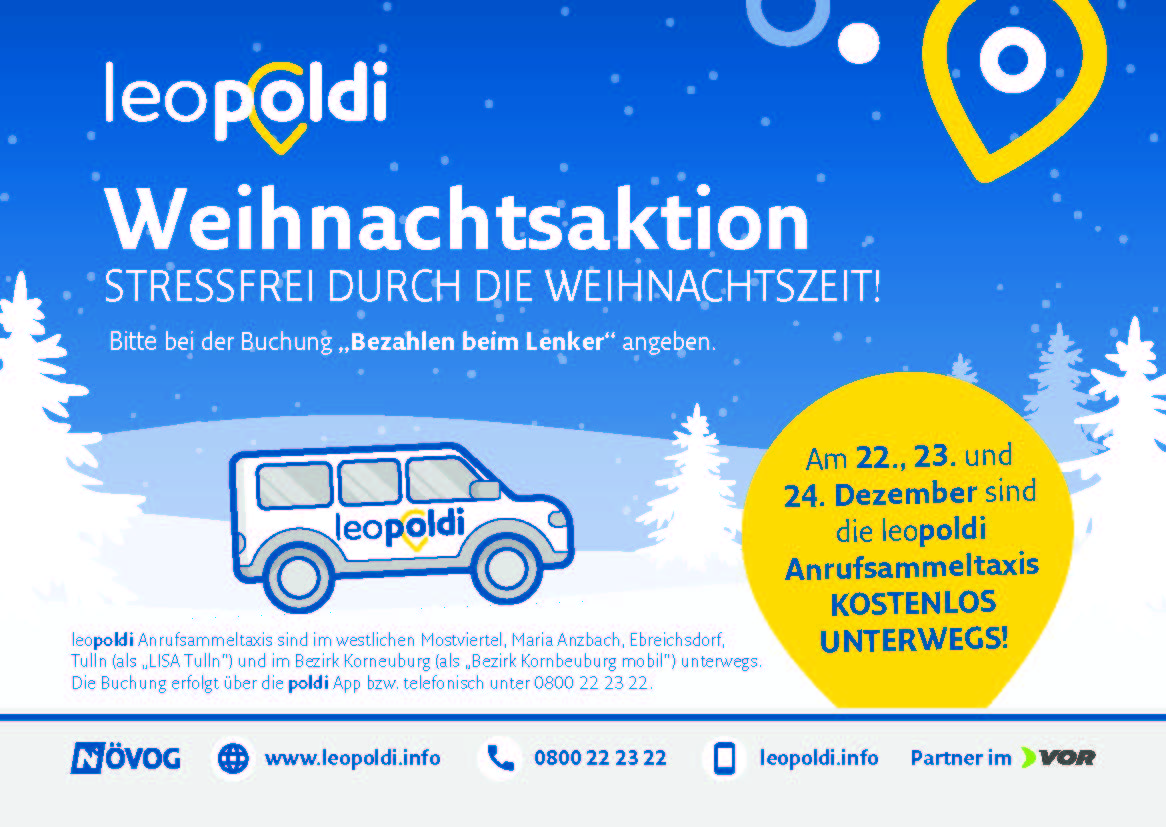 leopoldi Anrufsammeltaxis sind im westlichen Mostviertel, Maria Anzbach, Ebreichsdorf, Tulln (als „LISA Tulln“) und im Bezirk Korneuburg (als „Bezirk Korneuburg mobil“) als ideale Ergänzung zum klassischen Linienverkehr unterwegs. Die Buchung erfolgt über die poldi App bzw. telefonisch unter 0800 22 23 22. Die Nutzung der Anrufsammeltaxis ist von Montag, 22 Dezember bis inklusive Mittwoch, 24. Dezember kostenlos für alle Fahrgäste – sie müssen bei der Buchung über die poldi-App einfach „Bezahlen beim Lenker“ angeben und werden kostenlos befördert.