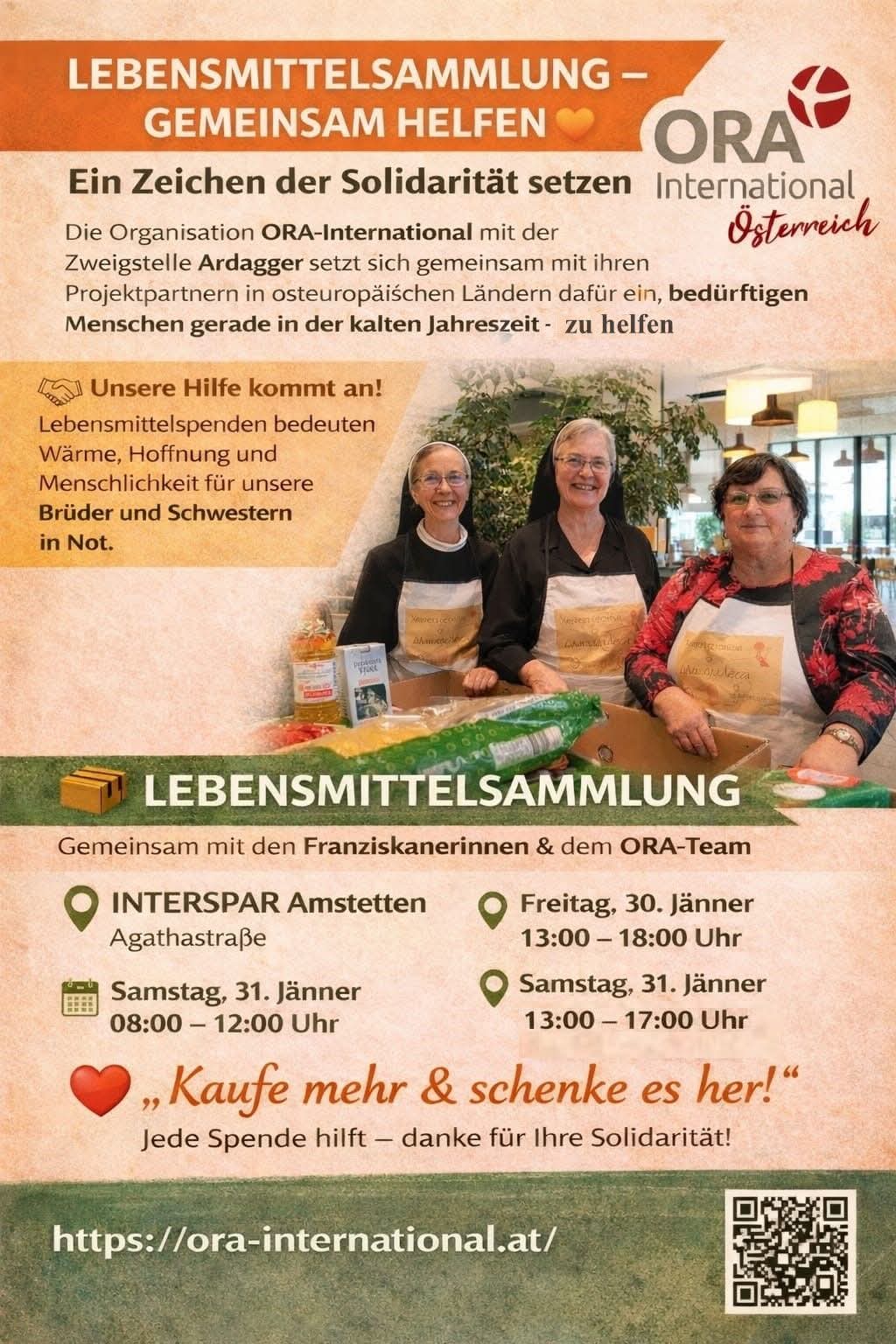 Am 30. und 31.1.2026 findet im Interspar Amstetten wieder eine ORA-Lebensmittelsammlung statt. Die freiwilligen HelferInnen von ORA freuen sich über ihre Spende für die Ärmsten in der Ostregion.