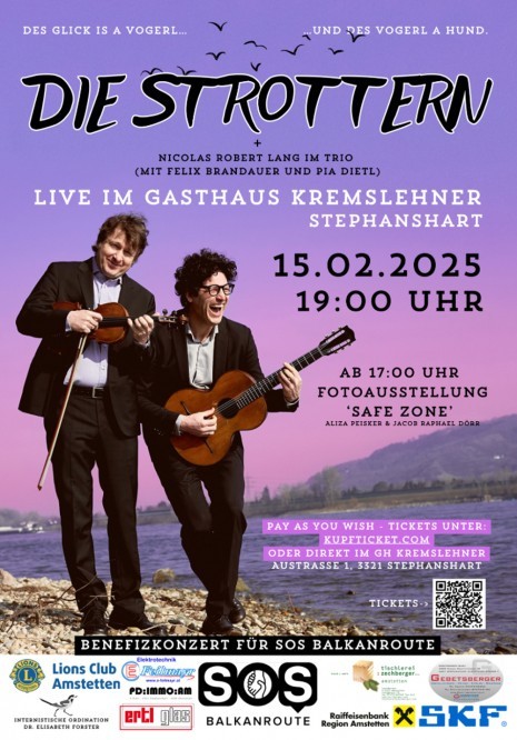 Nach der Reise nimmt sich Pia Dietl vor, ein Benefizkonzert zur Unterstützung der Helfer:innen an der Balkanroute zu organisieren. Bei der Suche nach einem passenden Musik-Act hört sie zufällig die Textzeile „Des Glick is a Vogerl, und des Vogerl a Hund“ aus einem Lied der unvergleichlichen Die Strottern. Danach geht es sehr schnell: Anschreiben, Anruf, Zusage – und die „Sensation“ ist perfekt: Die Strottern werden am 15. Februar 2025 im großen Saal des Gasthofes Kremslehner in Stephanshart die Herzen des Publikums verzaubern!