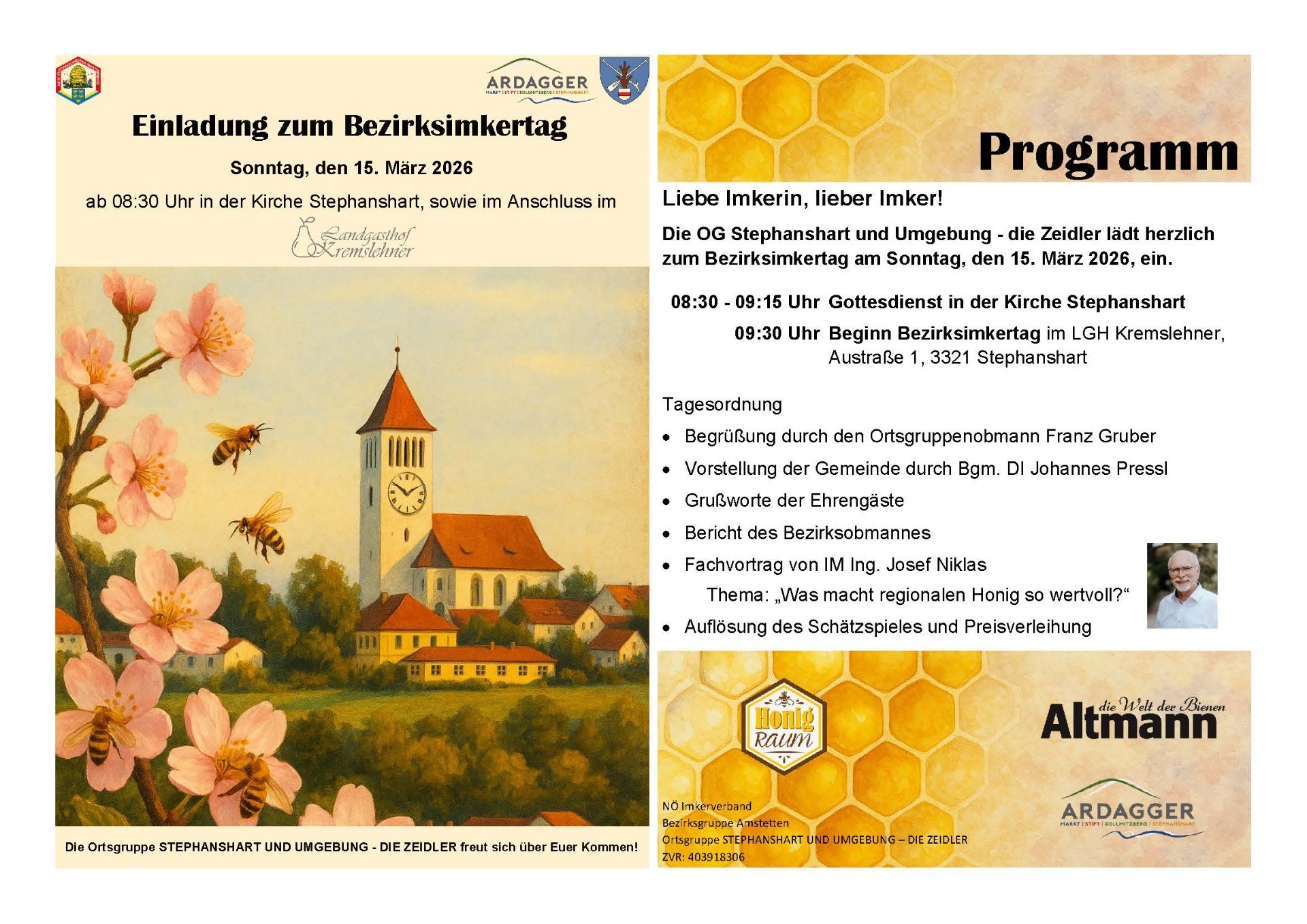 Begrüßung durch den Ortsgruppenobmann Franz Gruber Vorstellung der Gemeinde Ardagger Grußworte der Ehrengäste Bericht des Bezirksimkerobmann Fachvortrag von WL Ing. Josef Niklas Thema : Was macht regionalen Honig so wertvoll? Auflösung des Schätzspieles.Der NÖ Imkerverband , Ortsgruppe Stefanshart und Umgebung lädt herzlich zum Bezirksimkertag am Sonntag den 15. März 2026 ein .