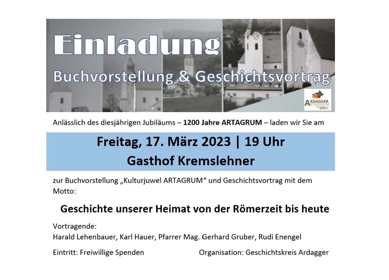 Der Geschichtskreis Ardagger wird am 17. März 2023 um 19 Uhr im Gasthof Kremslehner einen Vortrag rund um die 1.200 Jahre Artagrum, „Die bewegte Geschichte unserer Heimat“, abhalten und auch den Bildband vorstellen.