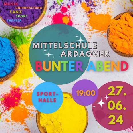 Am Donnerstag, 27. Juni 2024 (Beginn: 19:00 Uhr), findet der„Bunter Abend“ der Mittelschule Ardaggerstatt. Neben verschiedensten Darbietungen der Schüler*innen werden in diesem Rahmen auch unsere Abschlussklassen feierlich verabschiedet werden.