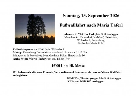Abmarsch: 5.00 Ortsplatz Stift Ardagger 16.00 Hl. Messe in Maria Taferl