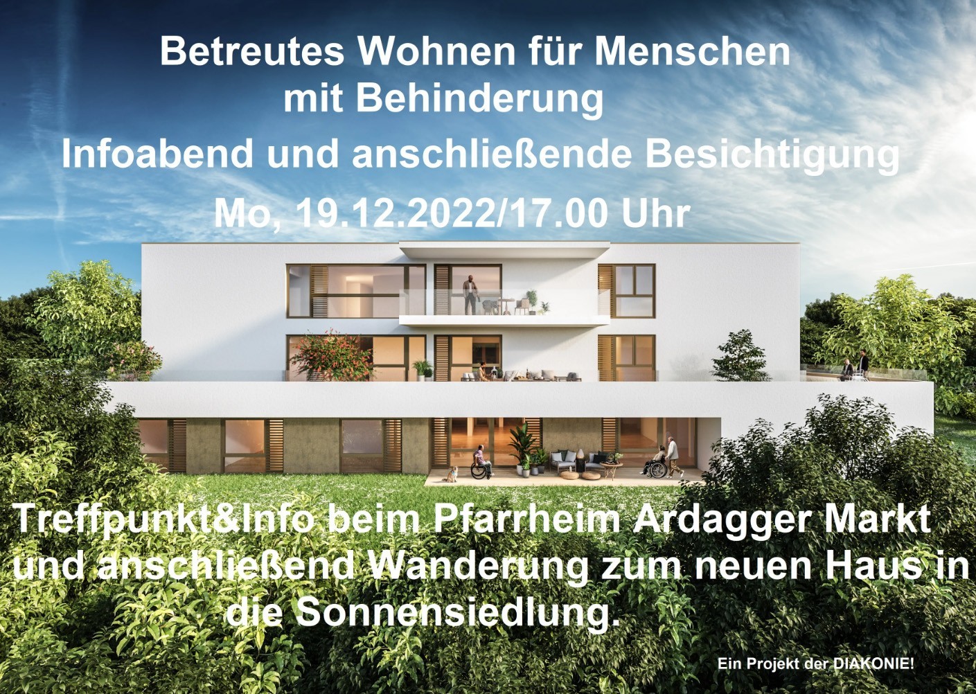 Am Montag, den 19. Dezember findet um 17.00 Uhr ein Infoabend zum neuen Projekt Betreubares Wohnen für Menschen mit Behinderung statt. Die Diakonie ist Träger des Vorhabens in der Sonnensiedlung. Mit Februar ziehen die ersten Klienten ein und deshalb gibt´s jetzt einen Info- & Besichtigungstermin. Treffpunkt ist am 19.12. um 17.00 Uhr im Pfarrheim Ardagger Markt. Nach grundlegenden Projektinfos geht´s dann in die Sonnensiedlung zur Besichtigung.