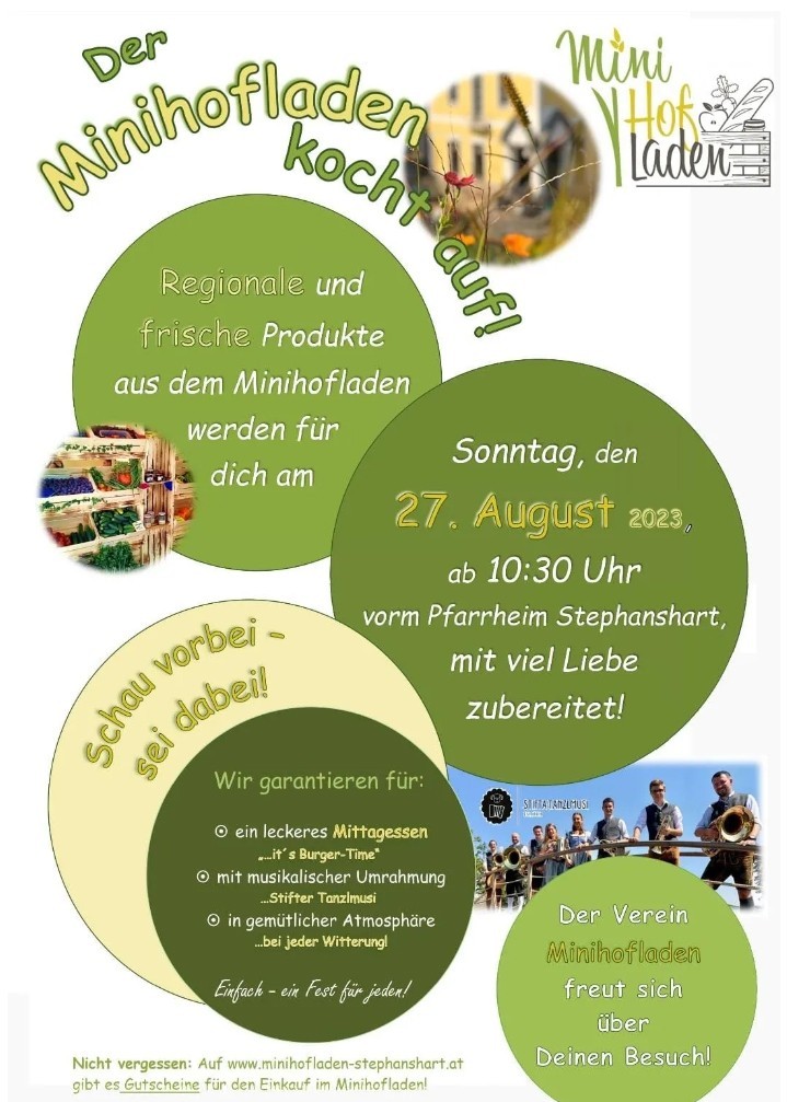 Die Mitglieder des Verein Minihofladen laden zu einem regionalen Mittagessen mit musikalischer Umrahmung herzlich ein! Auch mit leckeren Mehlspeisen können wir verwöhnen!Der Minihofladen kocht auf