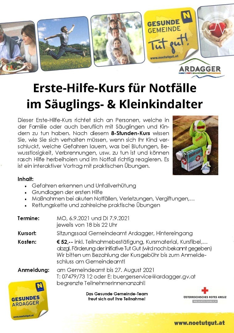 zu tun haben. Nach diesem 8-Stunden-Kurs wissen Sie, wie Sie sich verhalten müssen, wenn sich Ihr Kind verschluckt, welche Gefahren lauern, was bei Blutungen, Bewusstlosigkeit, Verbrennungen, usw. zu tun ist und können rasch Hilfe herbeiholen und im Notfall richtig reagieren. Es ist ein interaktiver Vortrag mit praktischen Übungen.