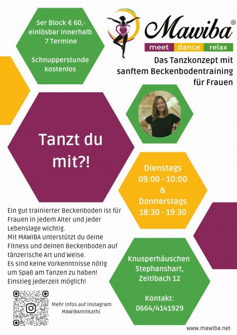Ein gut trainierter Beckenboden ist für Frauen in jedem Alter und jeder Lebenslage wichtig. Mit MAWIBA unterstützt du dein Fitness und deinen Beckenboden auf tänzerische Art und Weise. Es sind keine Vorkenntnisse nötig um Spaß am Tanzen zu haben! Einstieg jederzeit möglich!Das Tanzkonzept mit sanftem Beckenbodentraining für Frauen.