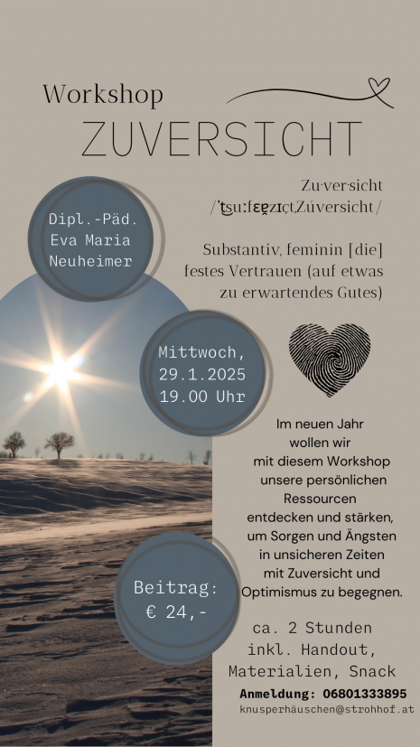 Im neuen Jahr wollen wir mit diesem Workshop unsere persönlichen Ressourcen entdecken und stärken, um Sorgen und Ängsten in unsicheren Zeiten mit Zuversicht und Optimismus zu begegnen.